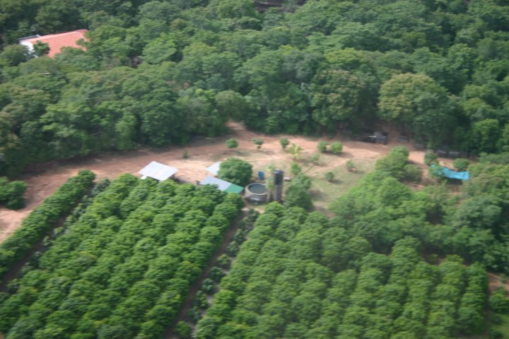 Photo: The litchi plantation on the foreground with vehicle garage on left, generator room and dam on the right. At the back Dwight’s house.