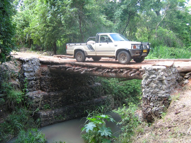 PHOTO: And there it is! I tested the new bridge this morning after heavy rain. I am carrying more than a ton of maize and beans to our bush school ….. and the bridge showed its power.