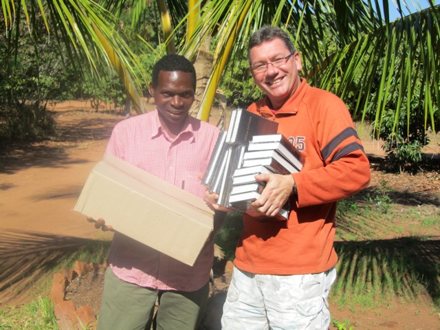 | Past. Gonsalves (left) sharing his story and receiving even more Bibles to take to the mountain people of Gorongoza. |